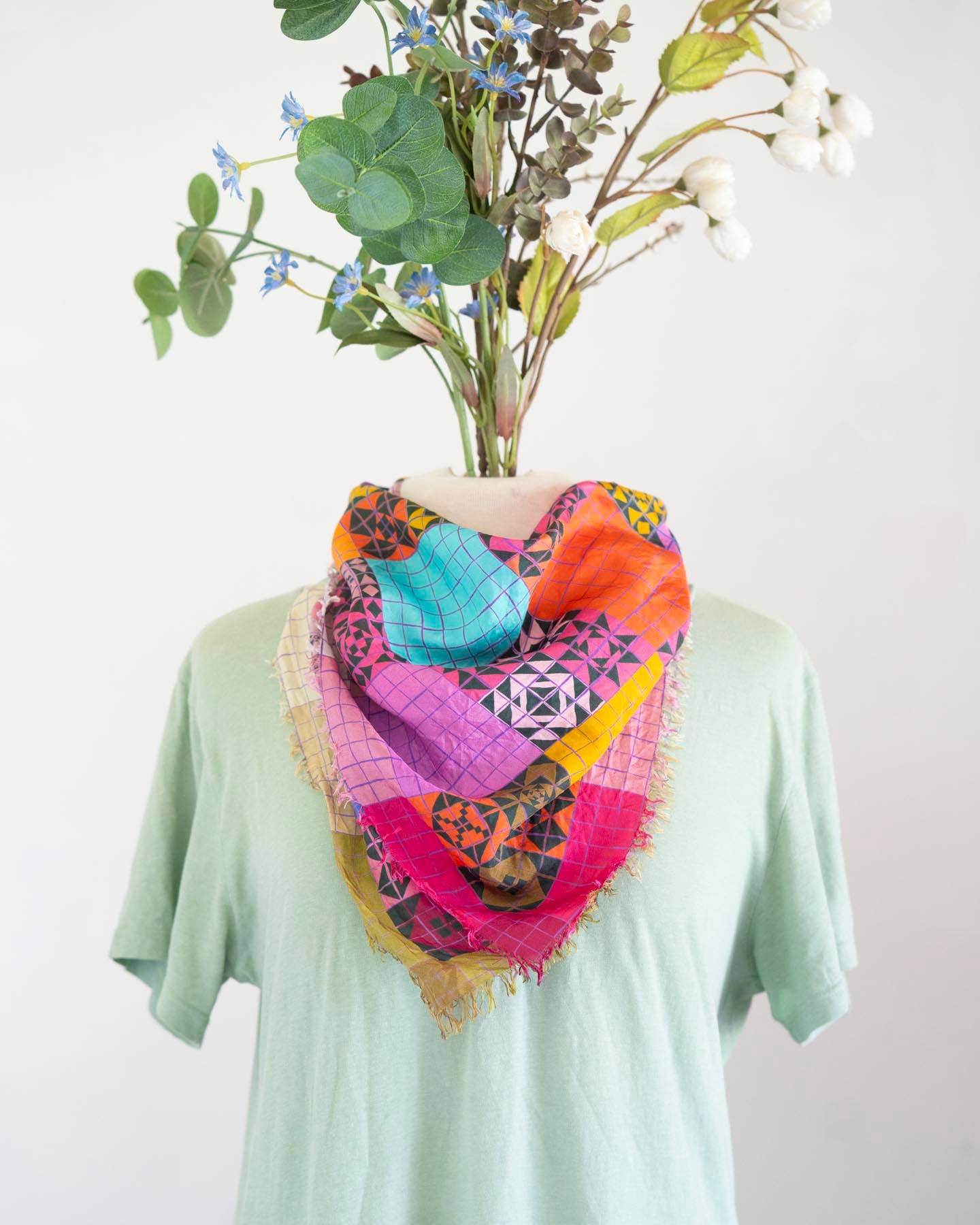 Inspired by patchwork and filled with color, there are so many ways to wear this scarf. You can style it to emphasise different color combinations depending on your mood. Made from a 100% Habotai silk, this scarf is slinky and smooth and light.