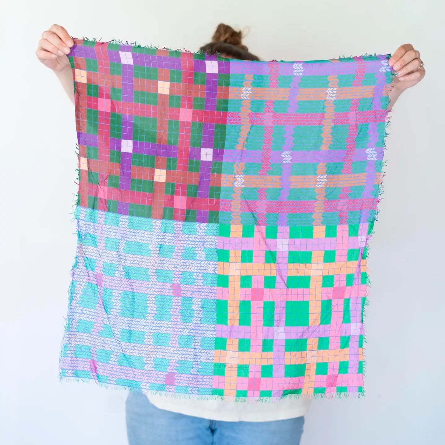 The geometric patterns were designed by Jess, cut and fringed in Truckee, California, the fabric was printed in the UK using GOTS Ecocare certified inks.