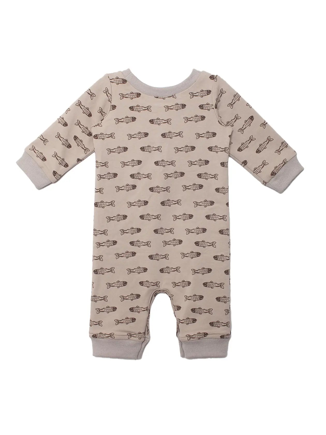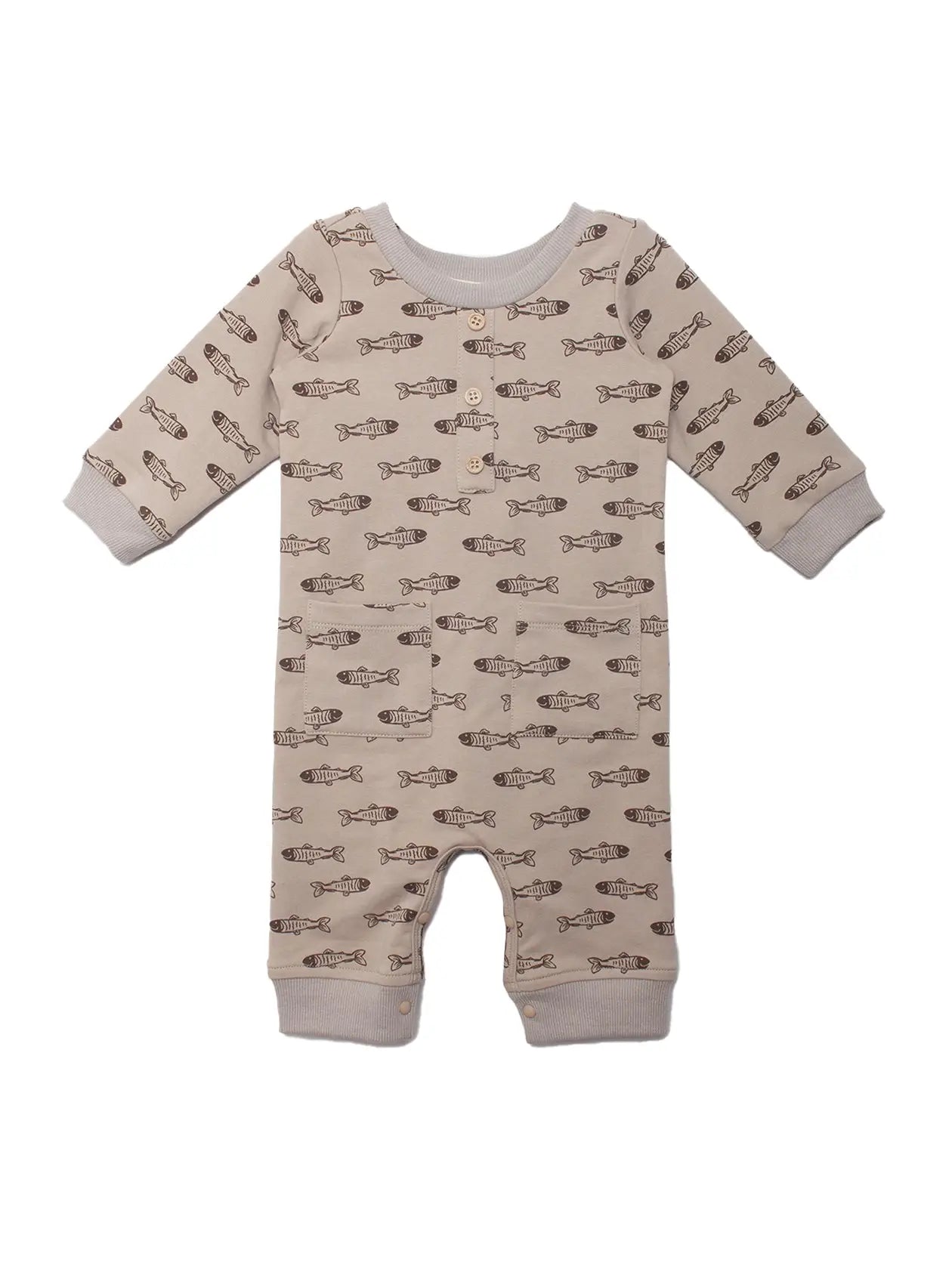 Keep your baby boy cozy and adorable in the Isaiah Romper. Made from a soft, breathable beige fabric, it features a playful fish skeleton pattern in dark brown. Thoughtful details like ribbed cuffs, a button-front design, and two small front pockets add both comfort and style. Perfect for everyday wear or special outings, it’s a wardrobe staple your little one will love.