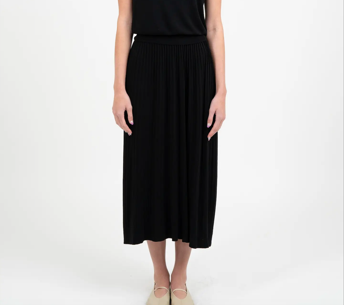 - Flowy pleated midi skirt with a comfortable elastic waistband - Lightweight and breathable fabric for all-day ease - Polished silhouette perfect for work or weekend - Pairs effortlessly with tees, blouses, or knit tops - An elevated basic that transitions seamlessly across seasons
