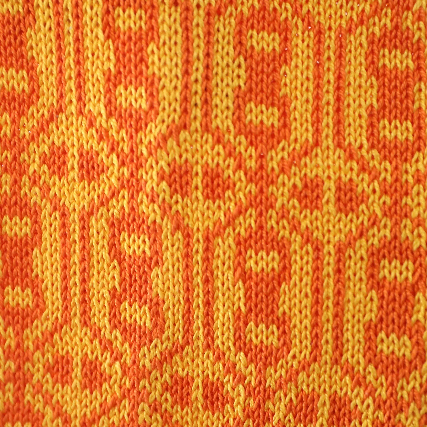Add a burst of color and festive cheer into your holiday décor with this vibrant knit holiday stocking. This stocking features a bold and intricate pattern in warm orange and yellow tones, creating a lively and inviting aesthetic. The bright blue cuff is adorned with a delicate snowflake motif, adding a touch of winter wonder, while the green and blue striped heel and toe, accented with orange, provide a playful and dynamic contrast.