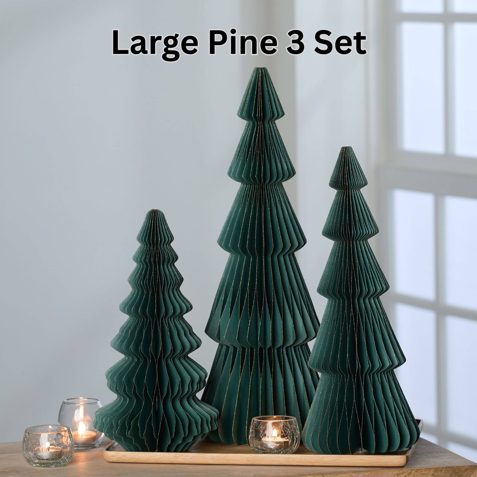 PRODUCT DETAILS: Set of 3 medium trees range from 6.5 inches to 13 inches tall. Set of 5 small includes are 4 inches to 8 inches tall. Large Set of 3 statement-sized trees range in height from 12.5 inches to 19.5 inches tall. Magnets, self-contained within the paper, make these trees sturdy, and easy to assemble. Sets ship flat, are easy to assemble creating a lightweight, sturdy and shapely design. Compact storage offers ease of use year after year.