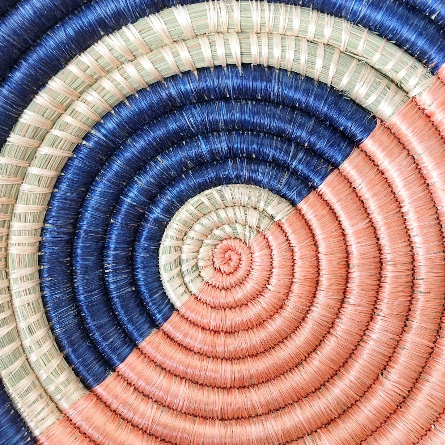 This sisal, woven basket is approximately 12" in diameter and woven by our artisans in Gitarama, Rwanda. The sisal is woven around sweetgrass, a fragrant grass with a subtle sweetness. In addition to making a beautiful table display, these baskets can also be hung as art. There is a loop on the back for hanging.