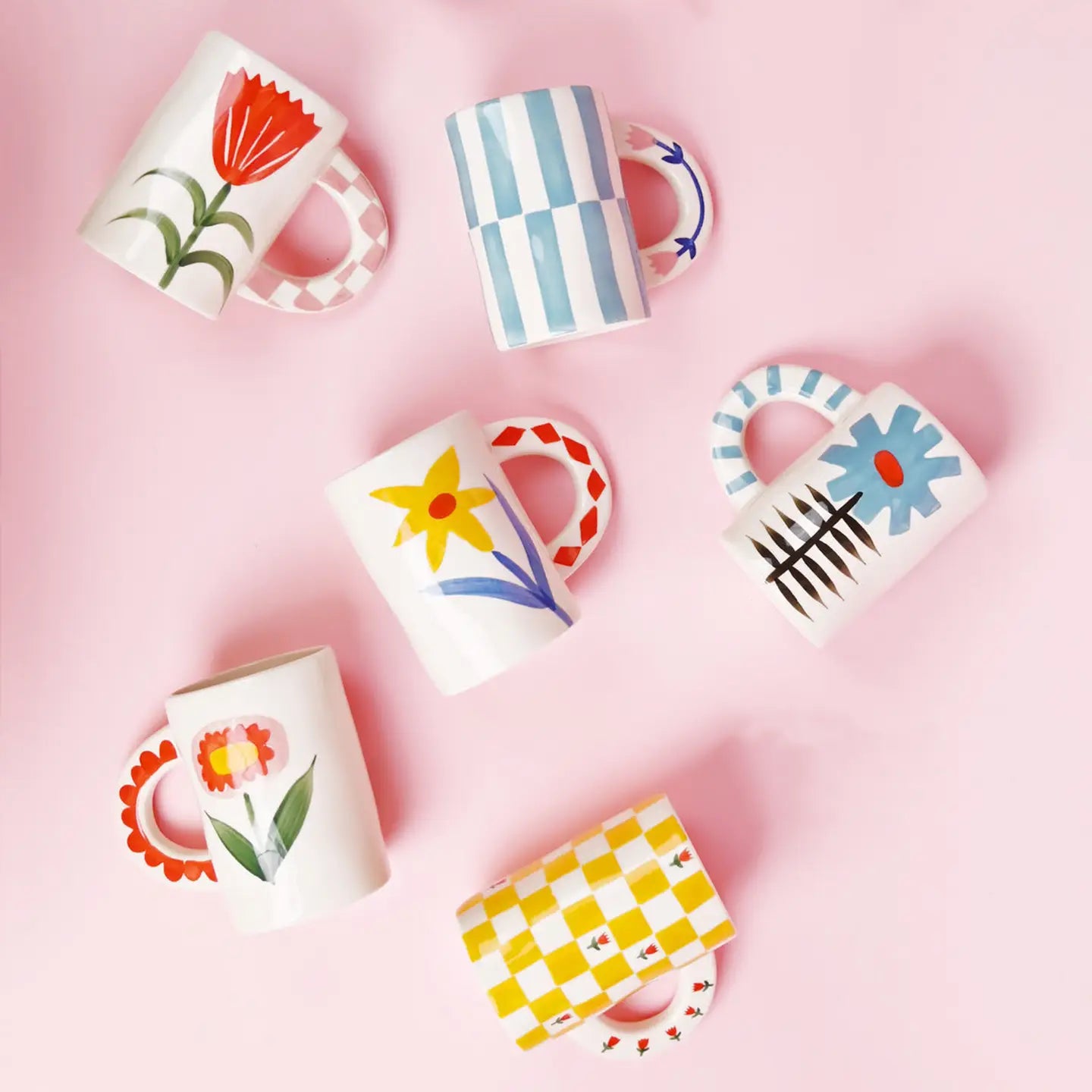 Each piece is carefully hand-painted with 100% stoneware and fired at 2282 °F. Featuring playful floral design and a bold, patterned handle.