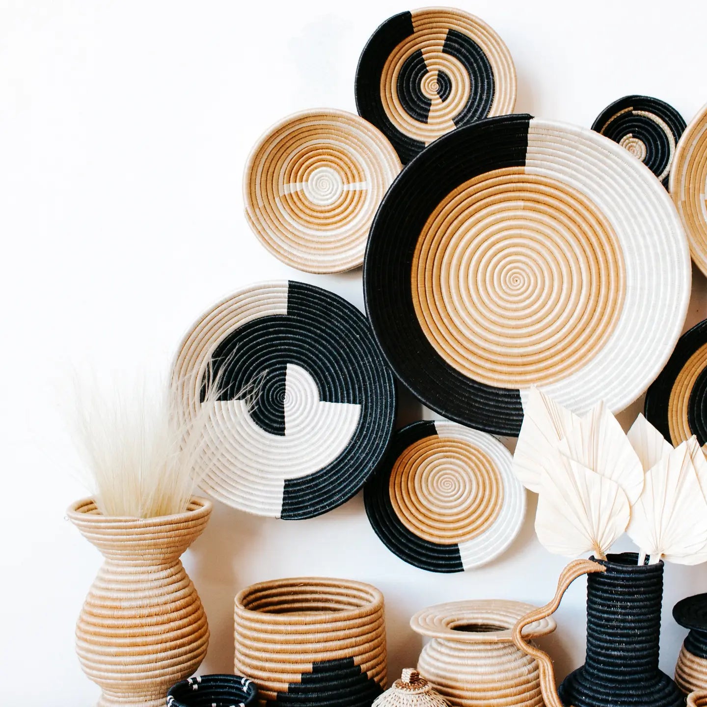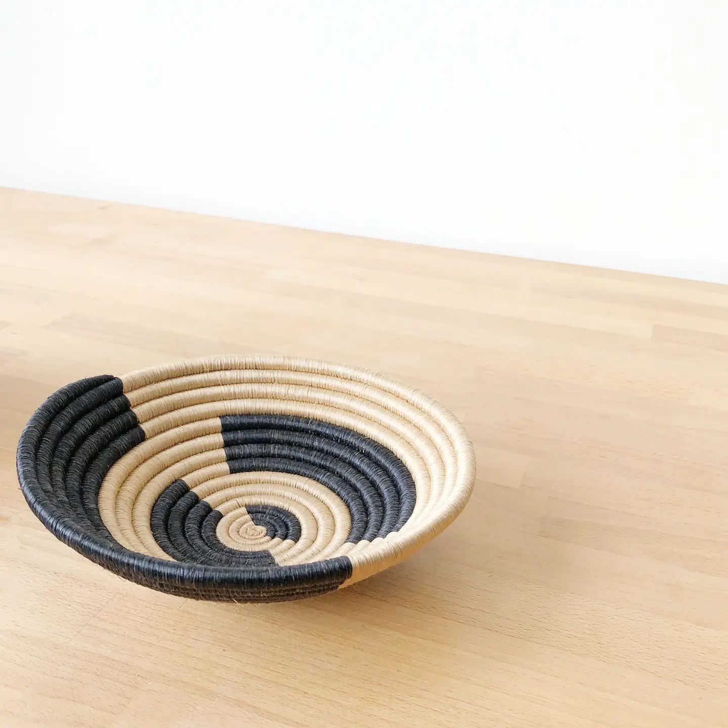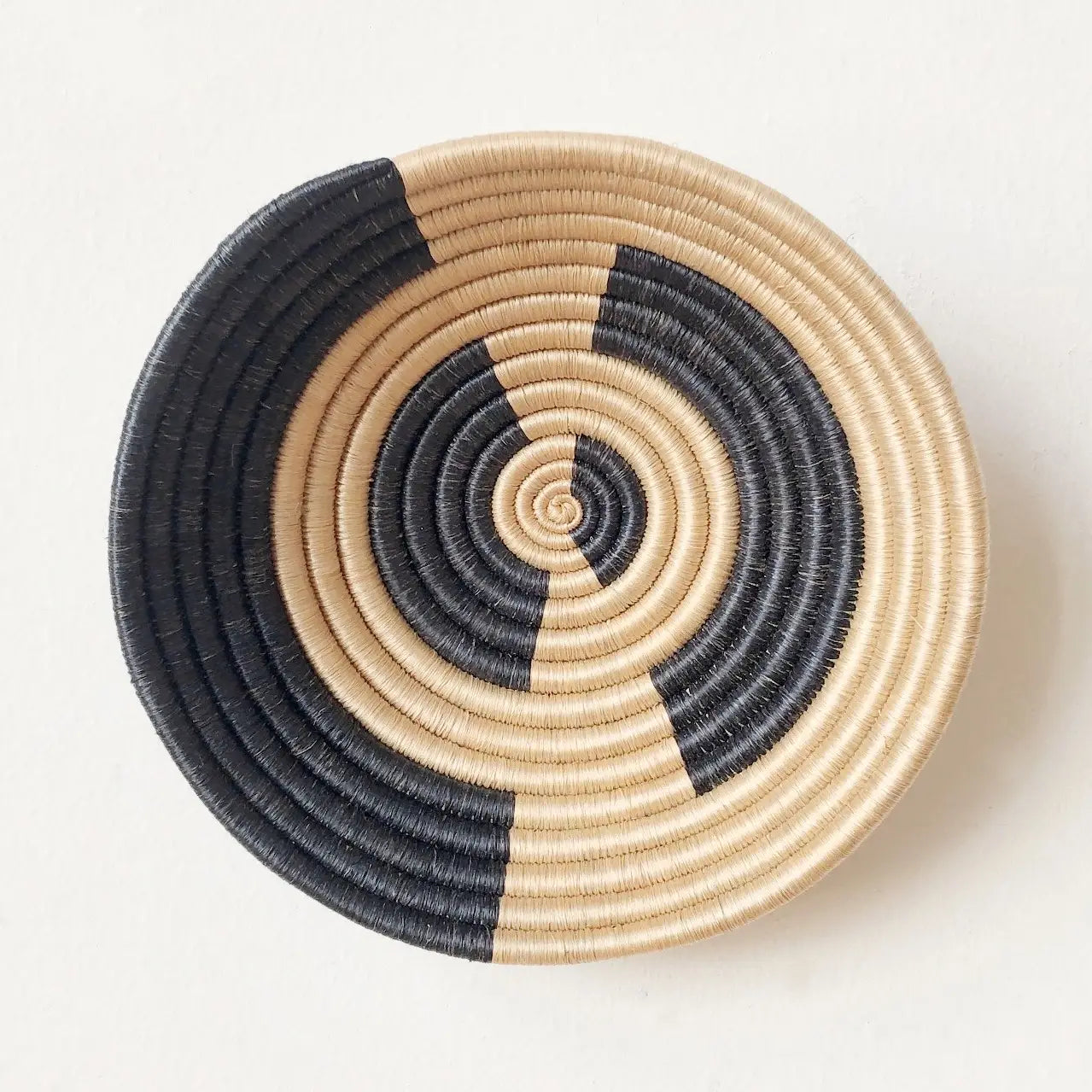 This sisal, woven basket is approximately 8" in diameter and woven by our artisans in Gitarama, Rwanda. The sisal is woven around sweetgrass, a fragrant grass with a subtle sweetness. In addition to making a beautiful table display, these baskets can also be hung as art. There is a loop on the back for hanging.