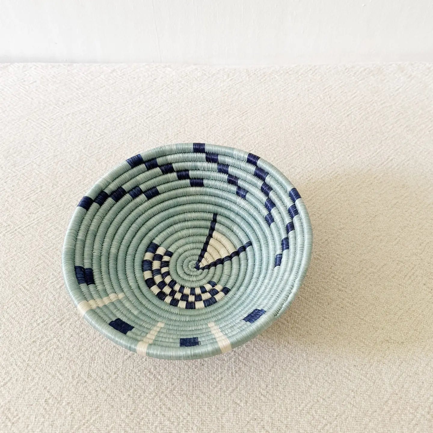 This sisal, woven basket is approximately 8" in diameter and woven by our artisans in Gitarama, Rwanda. The sisal is woven around sweetgrass, a fragrant grass with a subtle sweetness. In addition to making a beautiful table display, these baskets can also be hung as art. There is a loop on the back for hanging.