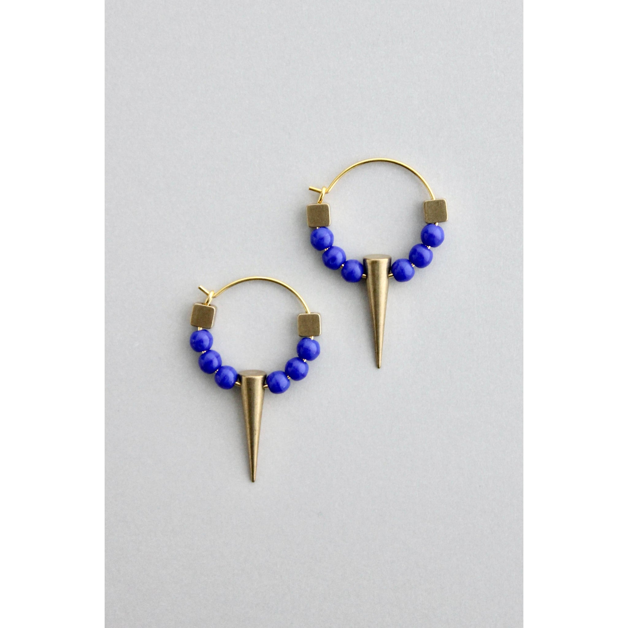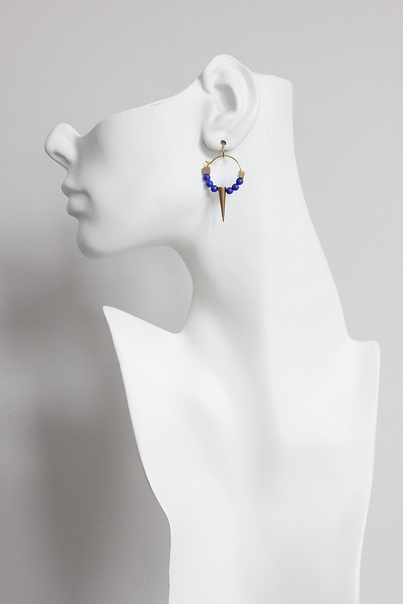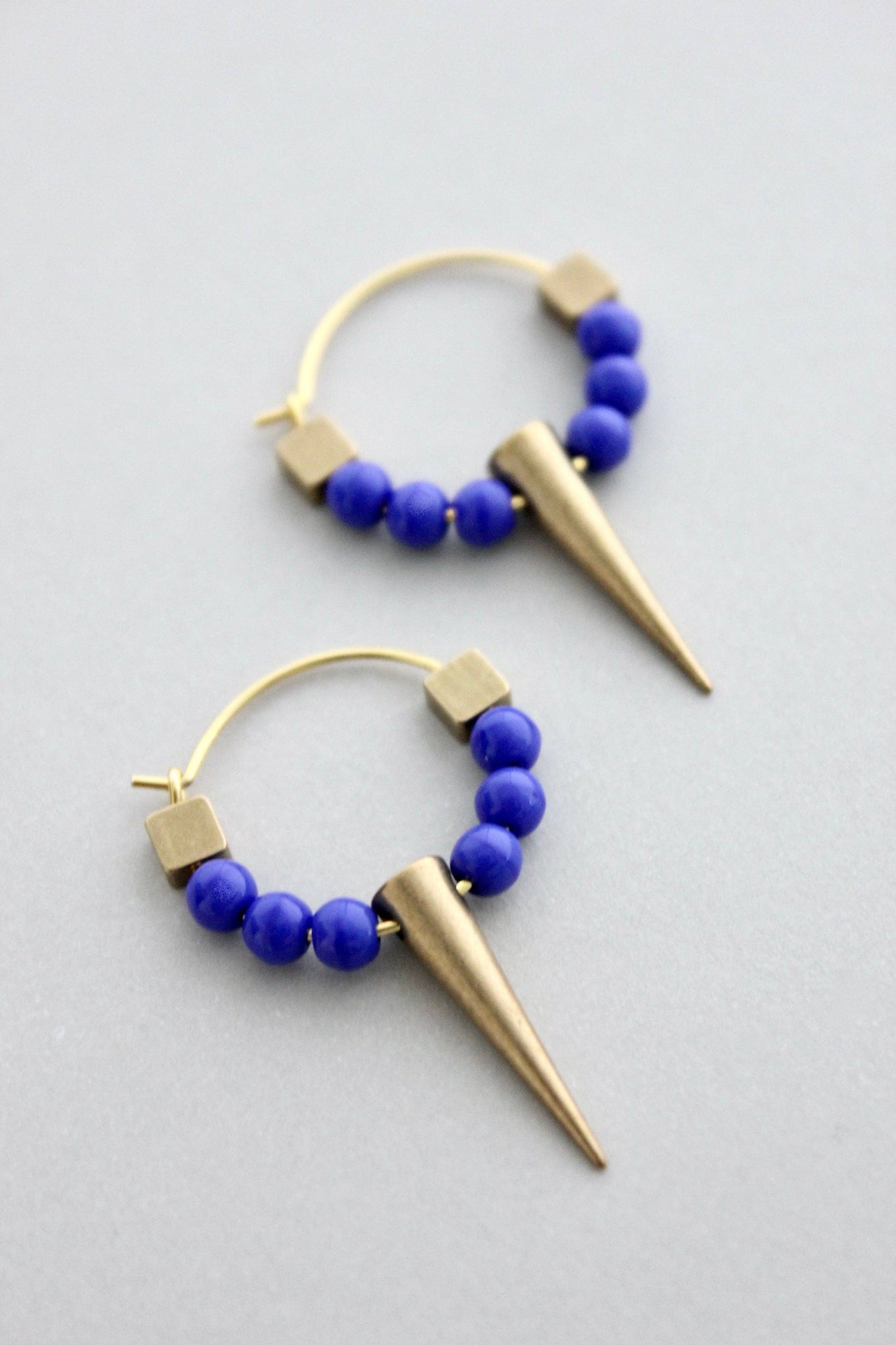 Small gold plated hoop earrings with glass and brass. Each earring weighs .085 oz and measures 1.25 inches