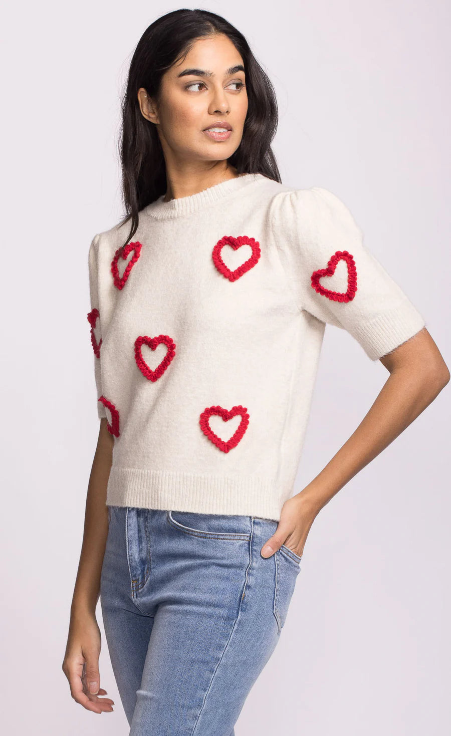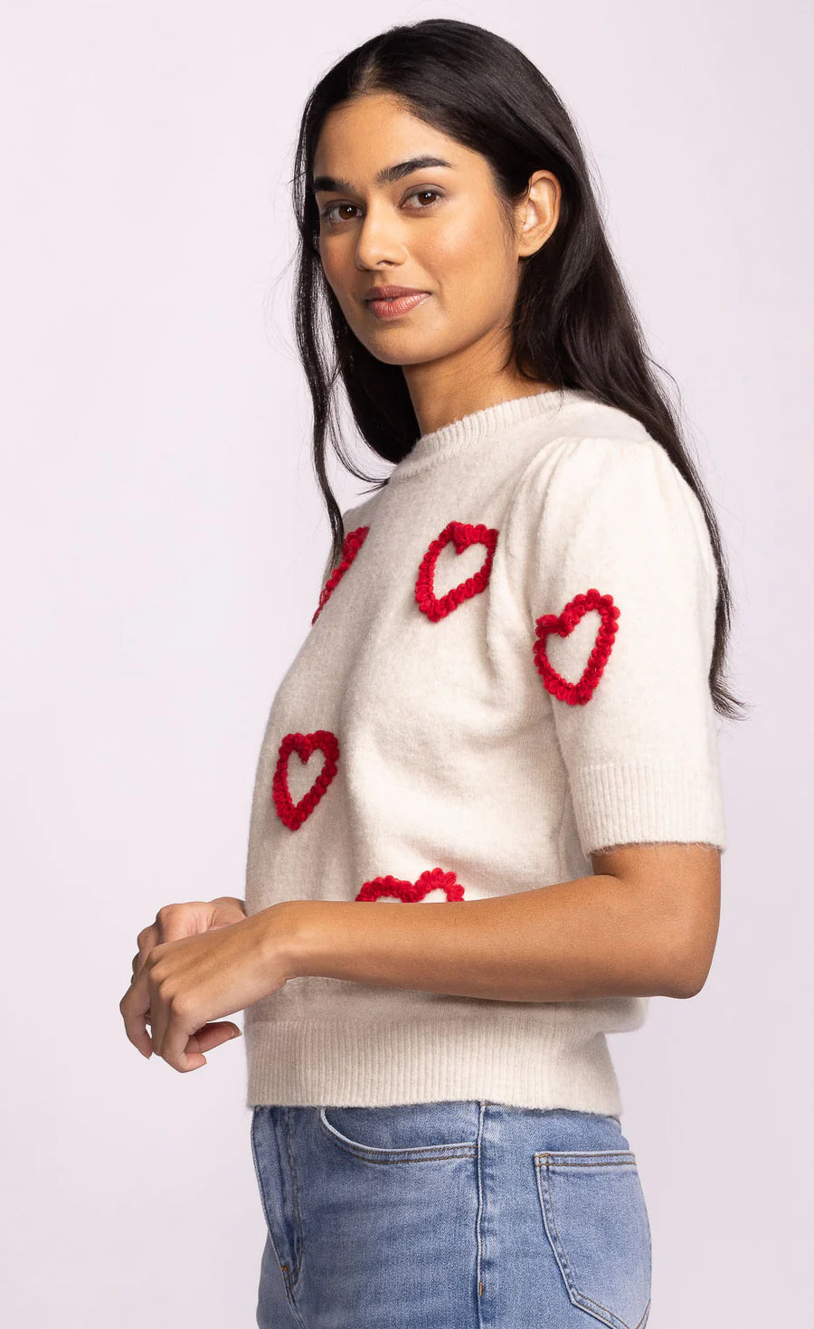 The Hart Sweater is a cozy short-sleeve knit sweater crafted from super-soft yarn. Designed with contrast heart appliqués for a feminine touch, it pairs effortlessly with jeans or a skirt for a comfy-cute outfit you'll reach for again and again.