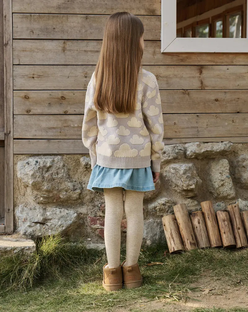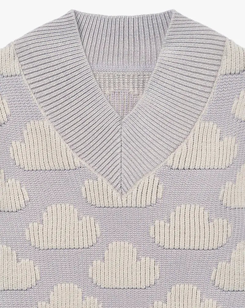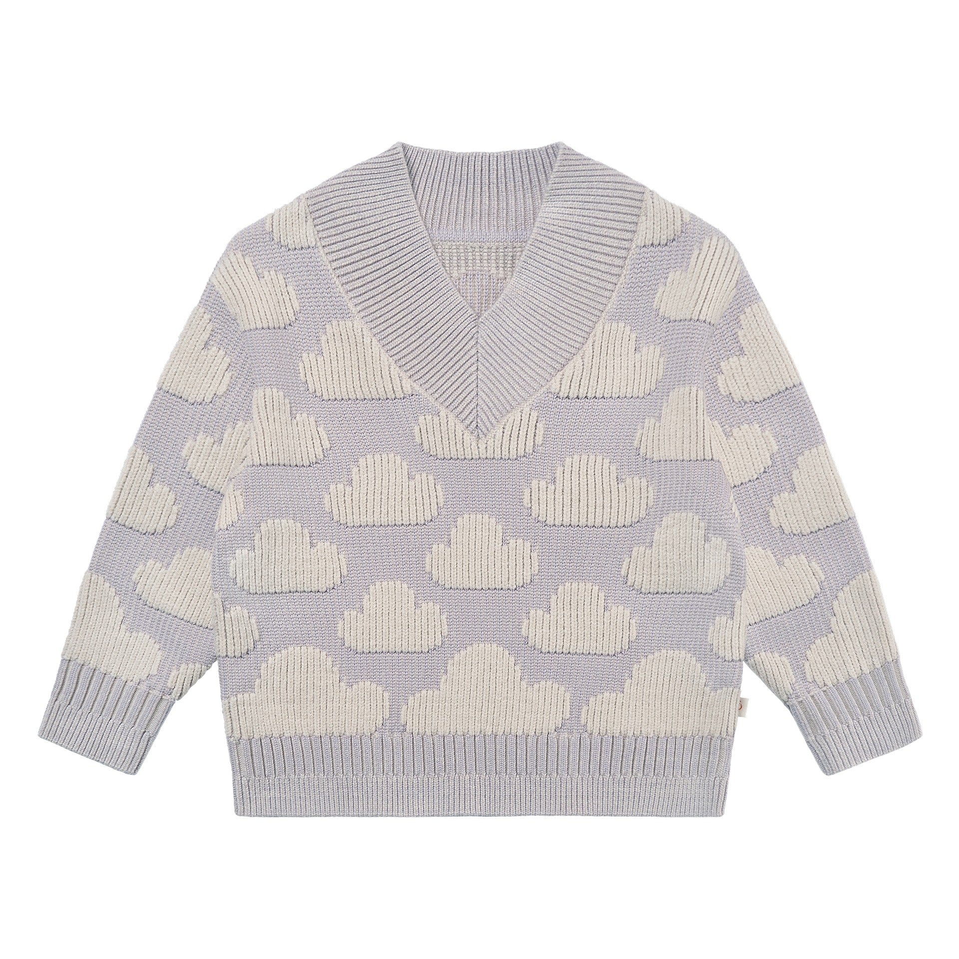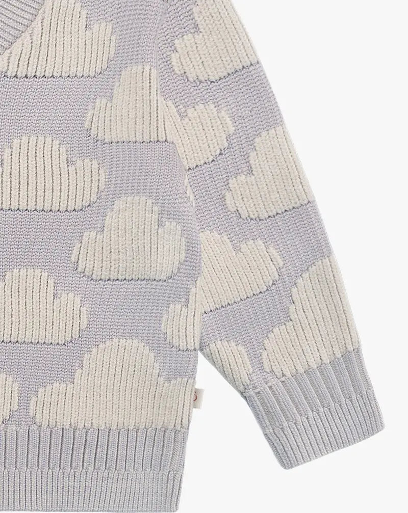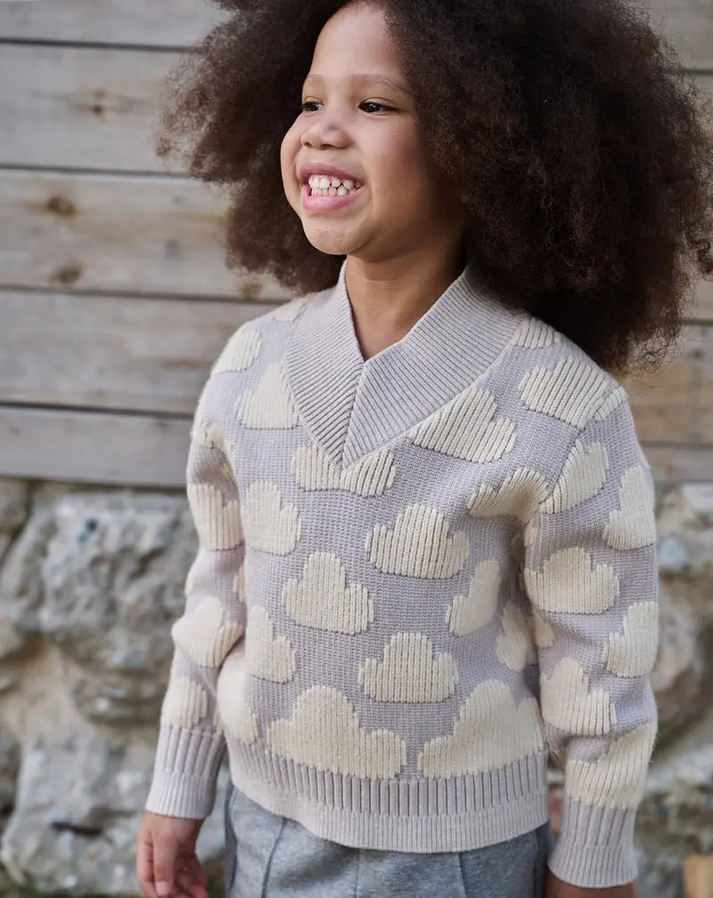 Cozy up in this dreamy knit sweater adorned with playful clouds in a soft, lilac blush. Warm, stylish, and made for layering for park days and school days.