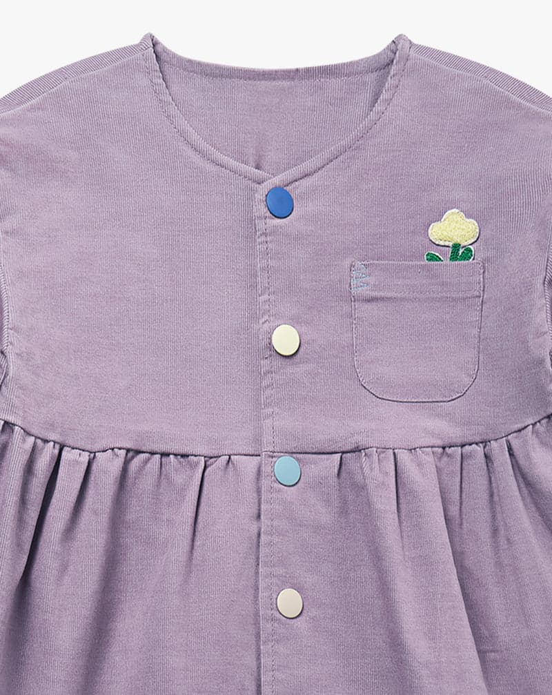 A soft corduroy dream! This dress has rainbow buttons (made from recycled plastic!), a cheerful yellow cloud flower on its pocket, puffed sleeves, and a playful flare - perfect for twirling, family pictures, and playground adventures.