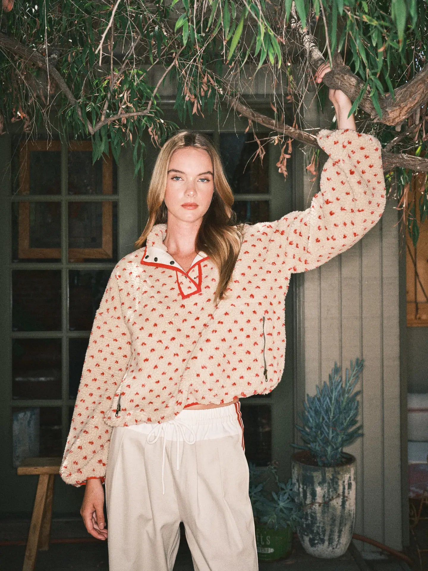 This ultra-soft teddy bear fleece pullover. Covered in charming red heart prints, this cozy layer features a relaxed fit, half-zip front, and stand-up collar for added warmth and style. Side zipper pockets add functionality while the plush texture wraps you in warmth.