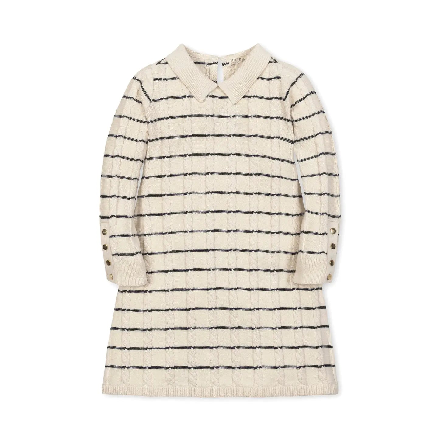 Meet one of our newest fall favorites for girl - this perfectly put-together long sleeve sweater dress in soft organic cotton. Features a sweet peter pan collar, cable knit detail, gold buttons at the cuffs, and a back keyhole closure for easy dressing. An absolutely darling look she's sure to love.