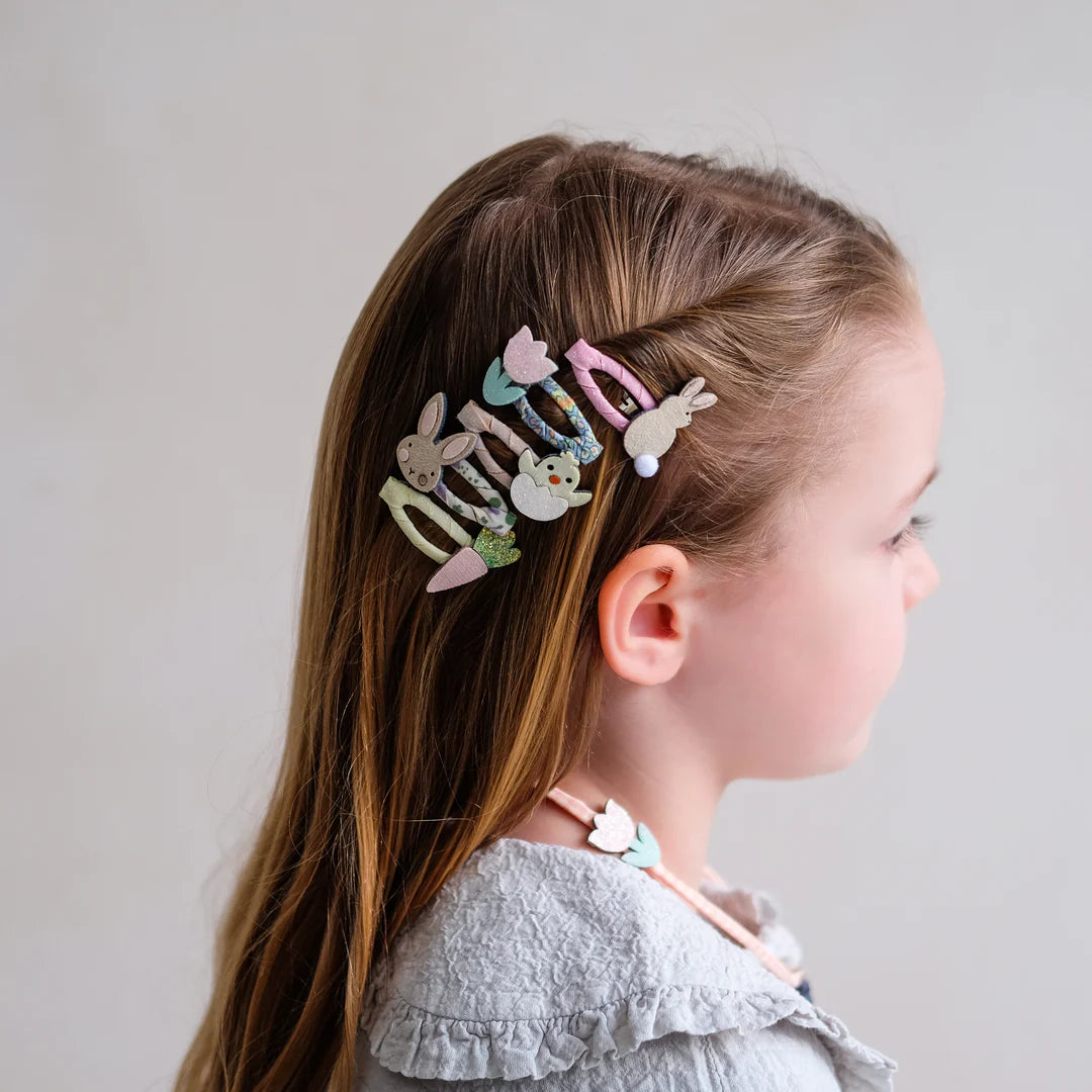 Decorate their 'do with this adorable five pack of mini clic clacs! Featuring two bunnies, a cute hatching chick, carrot and sweet tulip - it's the perfect pack for little ones with finer hair.