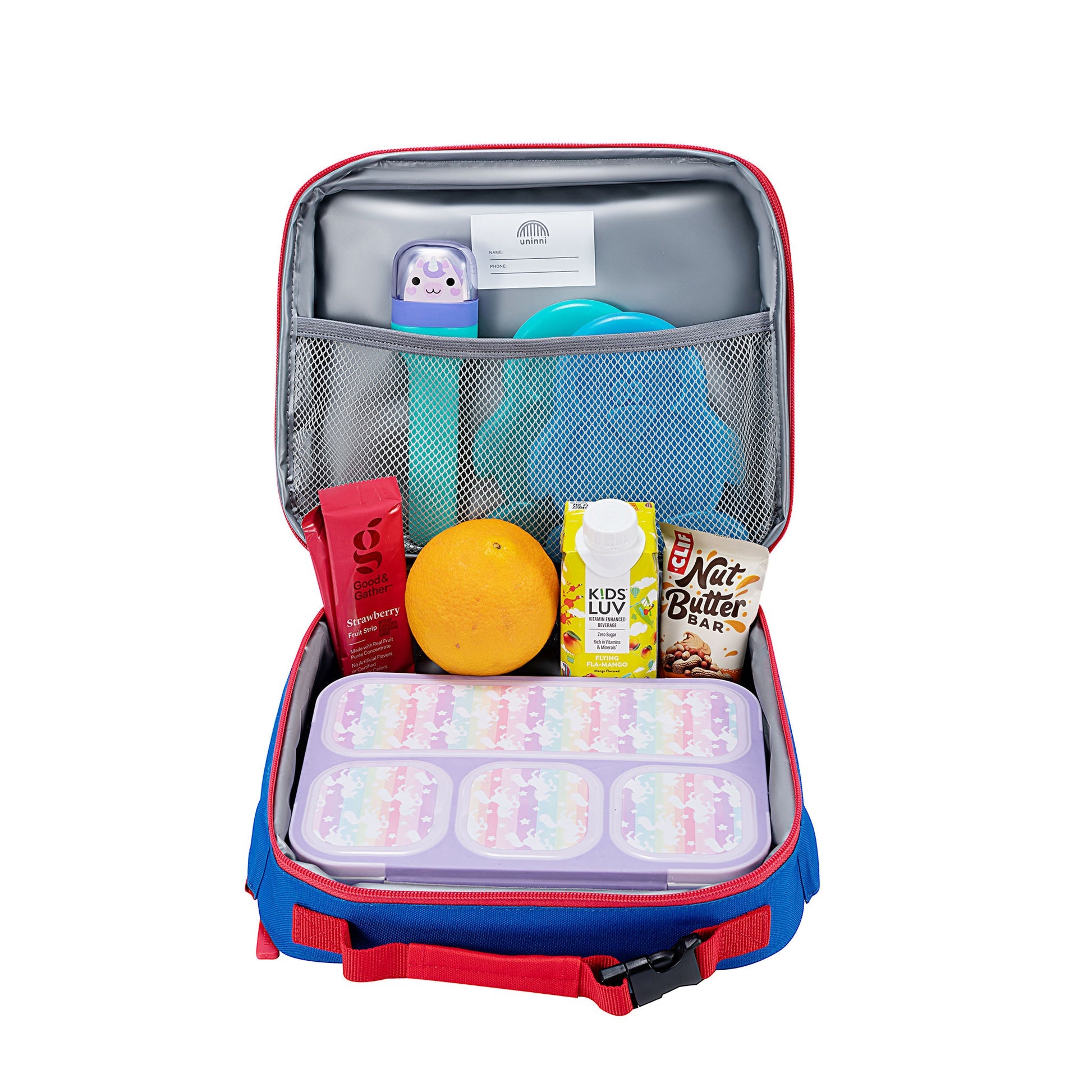 * With two hidden side buckles and one on the padded handle, kids can attach their lunch bag to the uninni backpack for hands-free carrying.