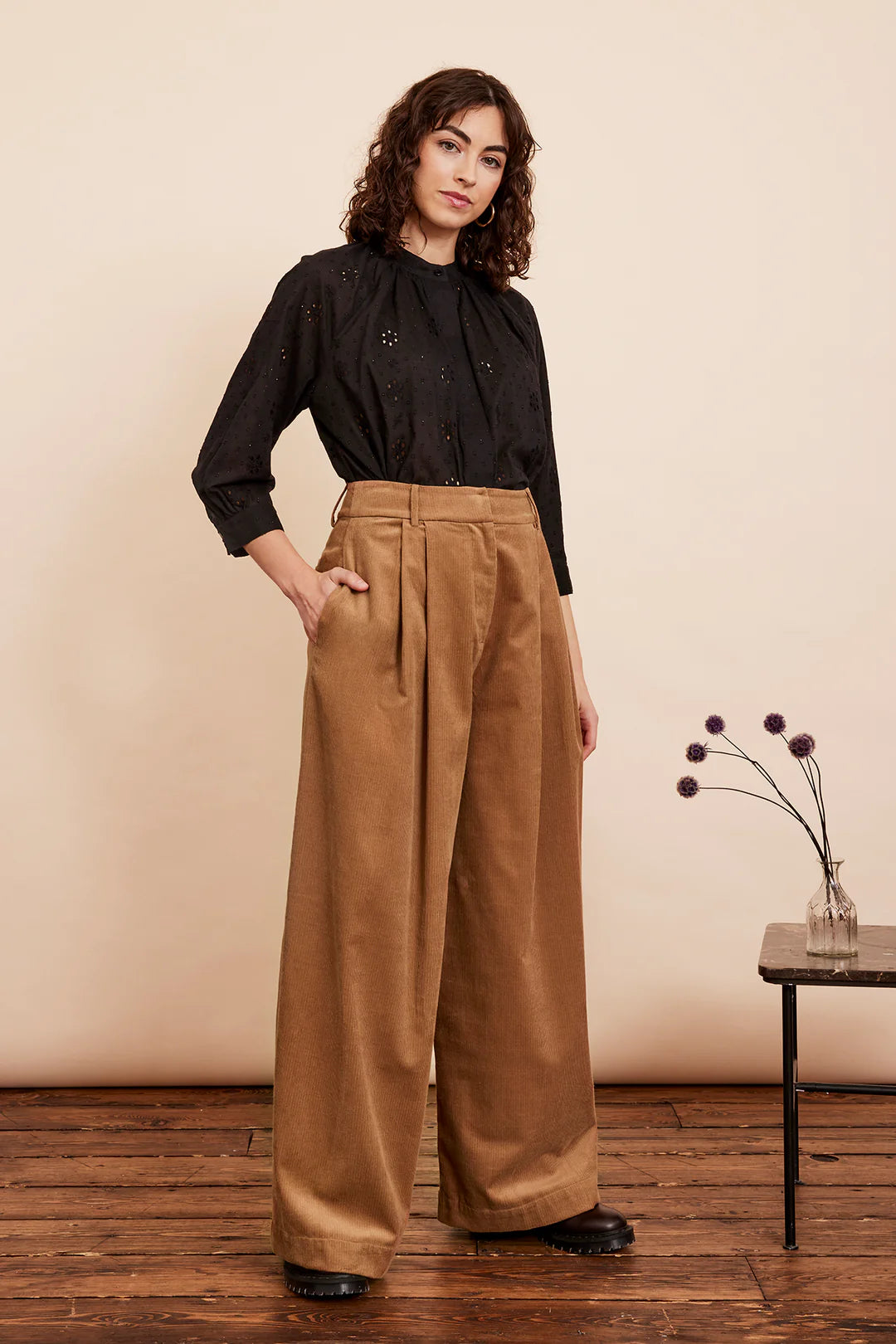 The Bianca Blouse is a ¾ length sleeve collarless blouse designed for a relaxed fit. The ¾ length raglan sleeves are gathered gently into buttoned cuffs, and the body is gathered gently into the neckline for volume and detail. Opening with a button-through front and featuring a simple top button over a covered placket.