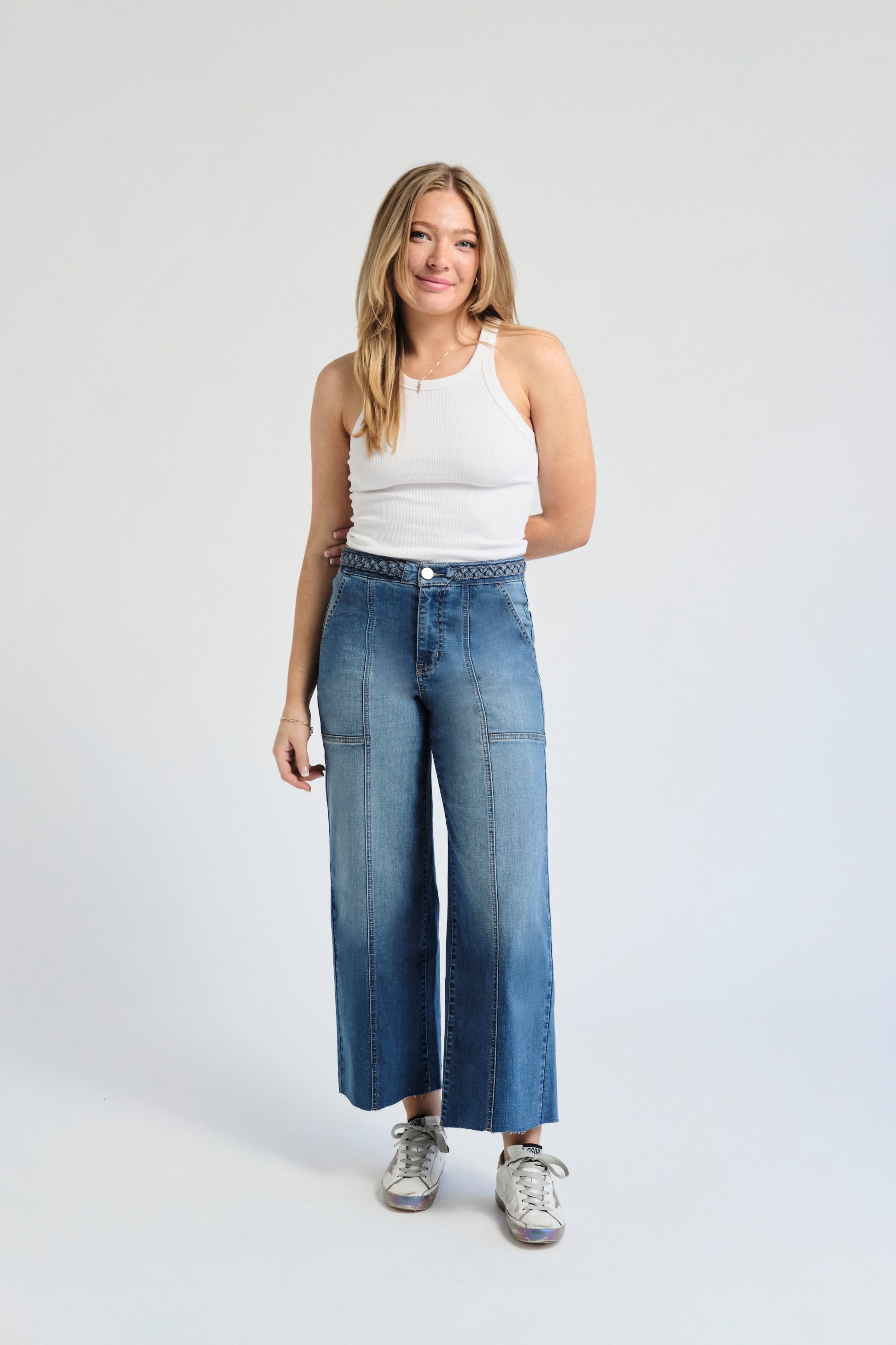 Our new favorite Spring and Summer wardrobe staple. These cropped, wide-leg jeans feature a high waist, seamed patch pockets and raw hems to set them apart from the rest. The wash is the perfect medium vintage blue named Bolt, and they have an amazing, braided waistband to show off your best asset- no belt required here!!!