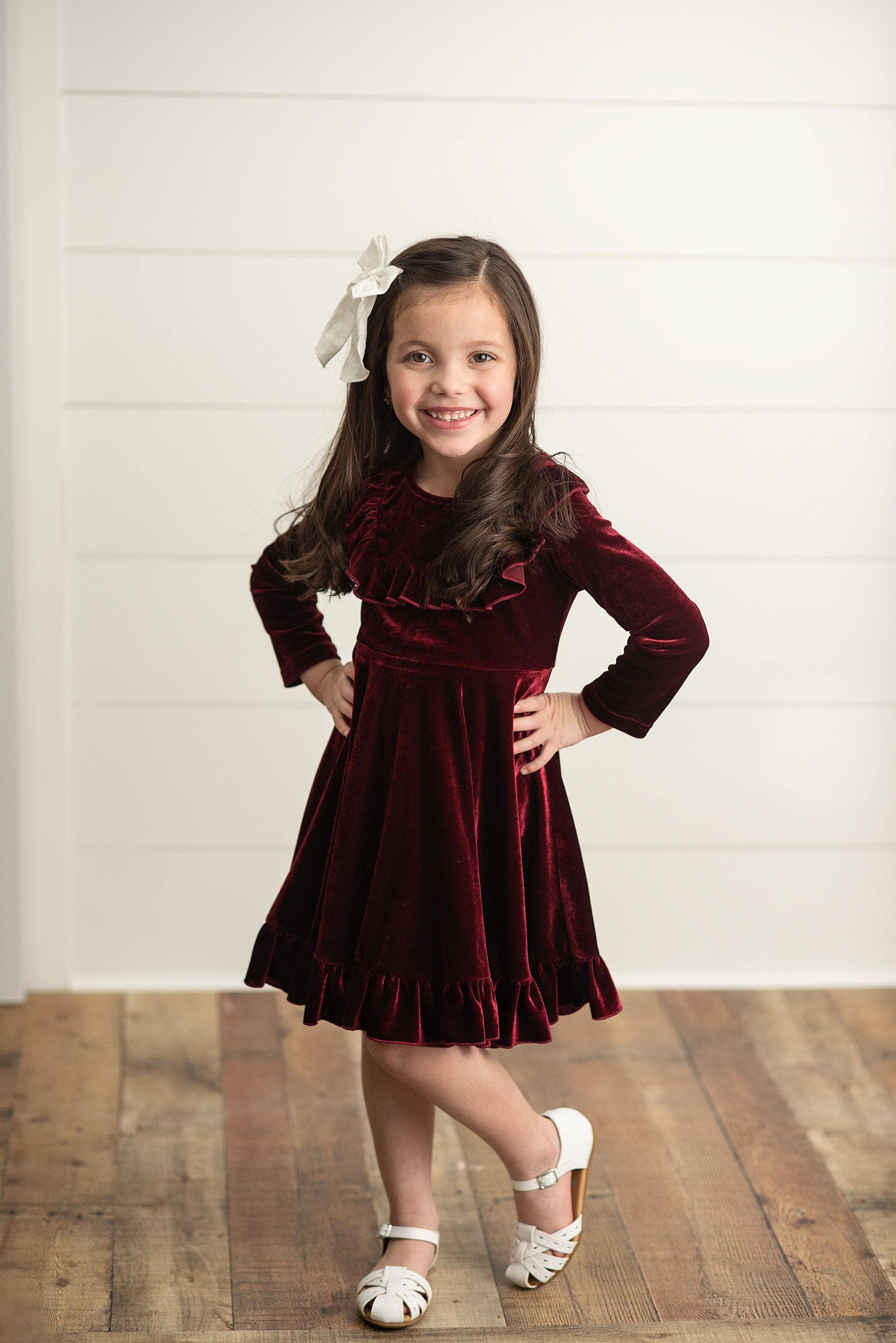 Girls wine velvet long sleeve ruffle bib dress with keyhole detail on the back. The perfect Fancy party dress for winter holiday gatherings and parties!