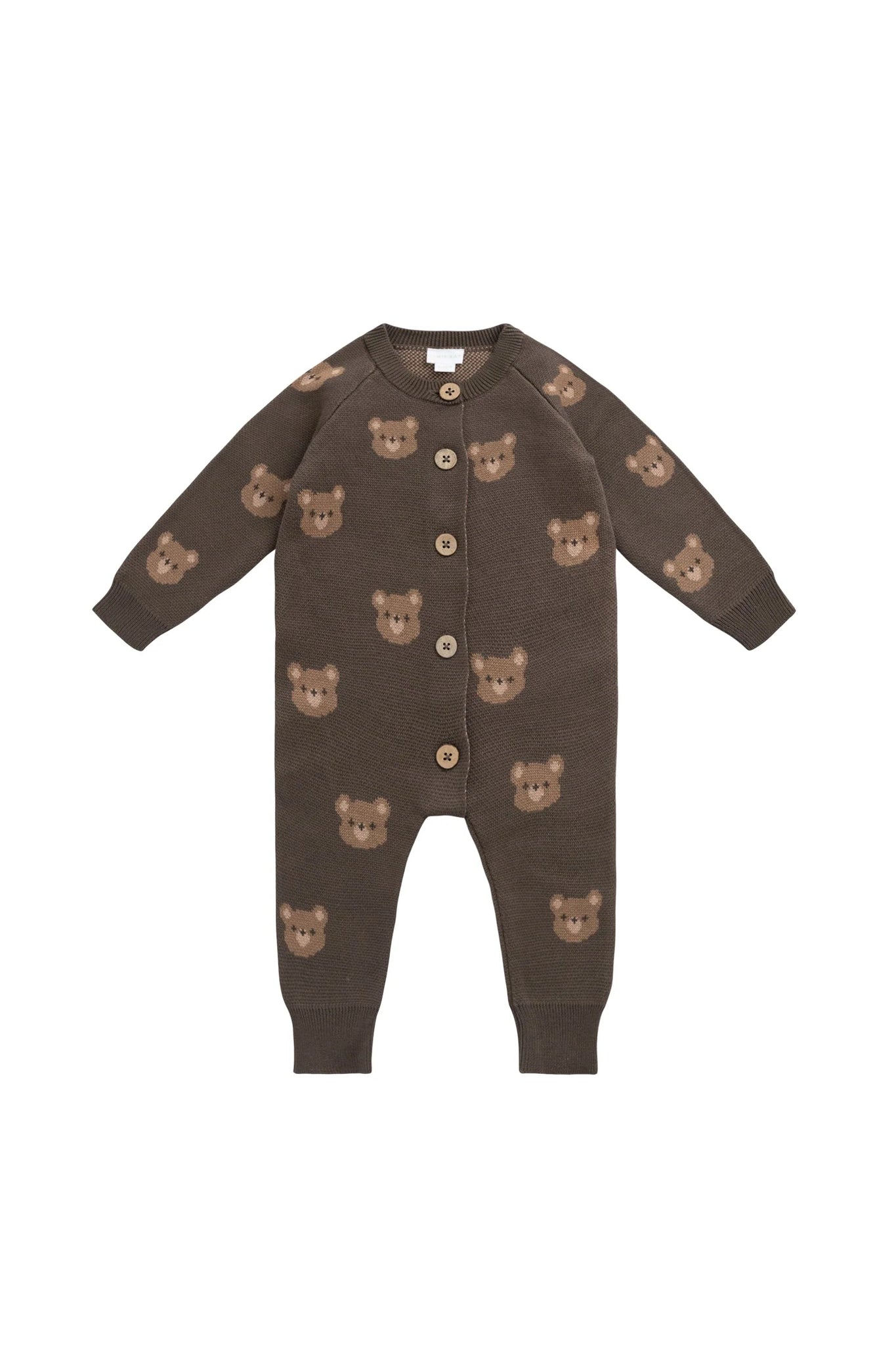 The Marlow Onepiece in Bobbie Bear Canteen is a charming and practical knit for your little one. Crafted in a warm brown tone, this long-sleeved, full-length onepiece features an adorable all-over bear pattern, coconut buttons down the front, and ribbed cuffs for a snug fit.