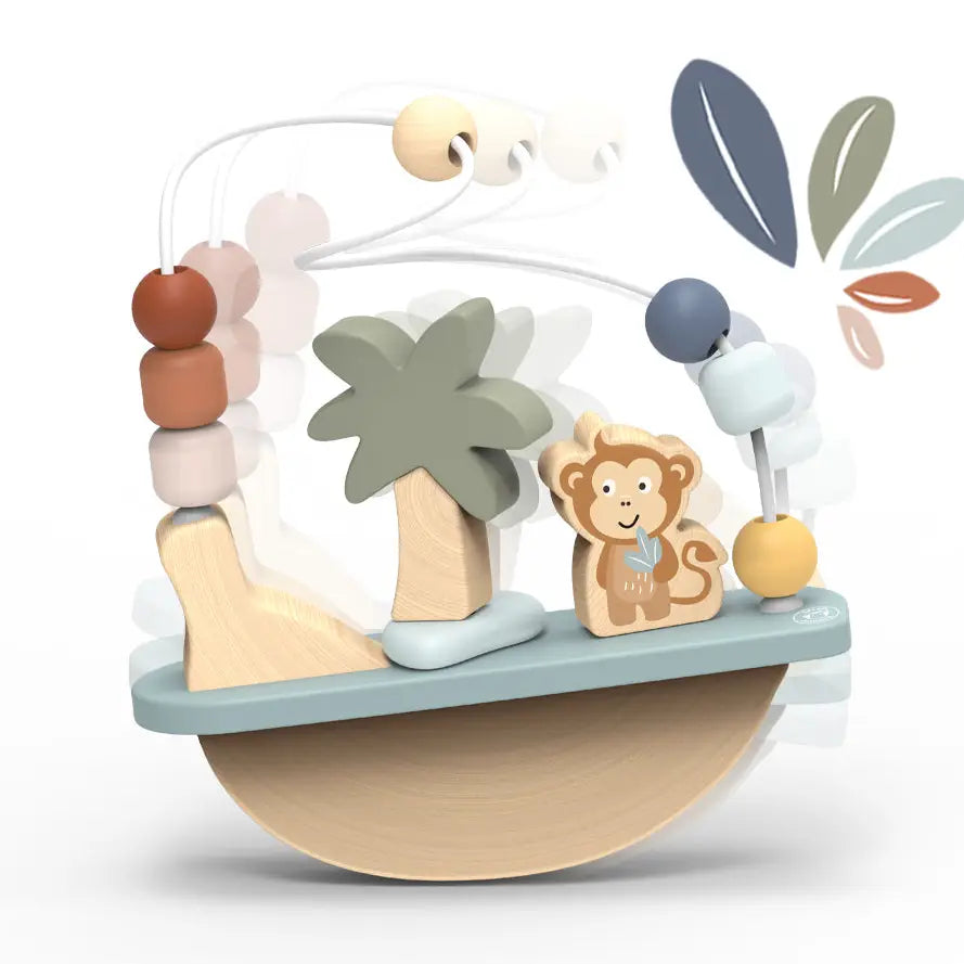 This soft colored FSC Certified Wood from our certified supplier en monkey bead maze rocks gently from side to side and twists and turns around and around.