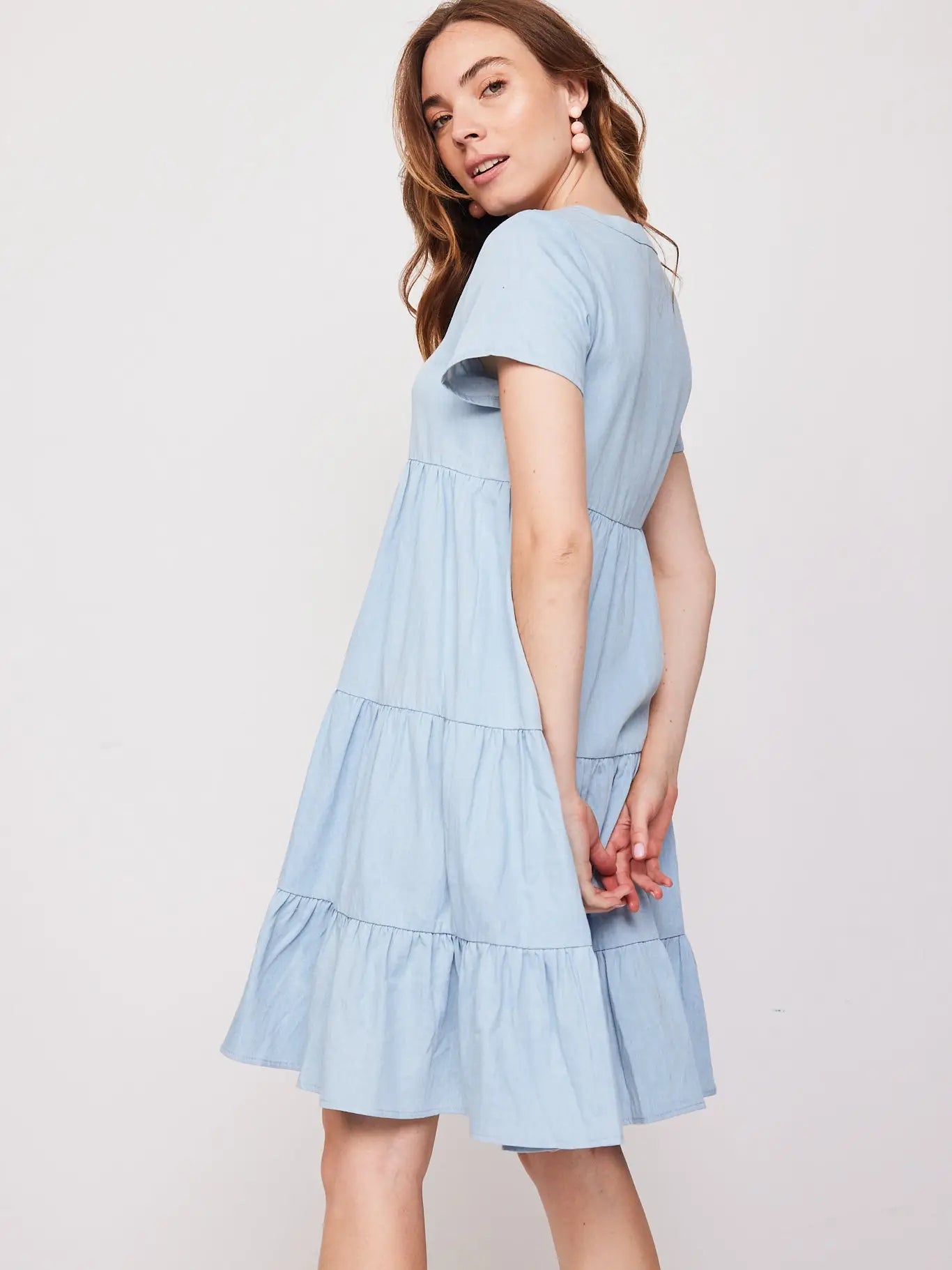 Short sleeves button front dress with tiering up to the knee. Such an easy dress for the summer season.