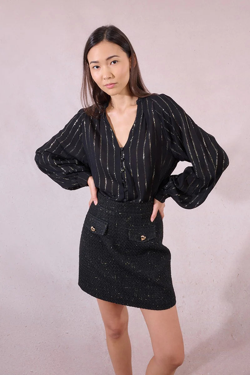 -Flowing striped and iridescent shirt-Semi-sheer fabric-Long balloon sleeves, tightened cuffs-Semi-high collar with ruffle-V-neckline-Covered button closure on the middle front-Length from the shoulder 25.2 inch for a size S