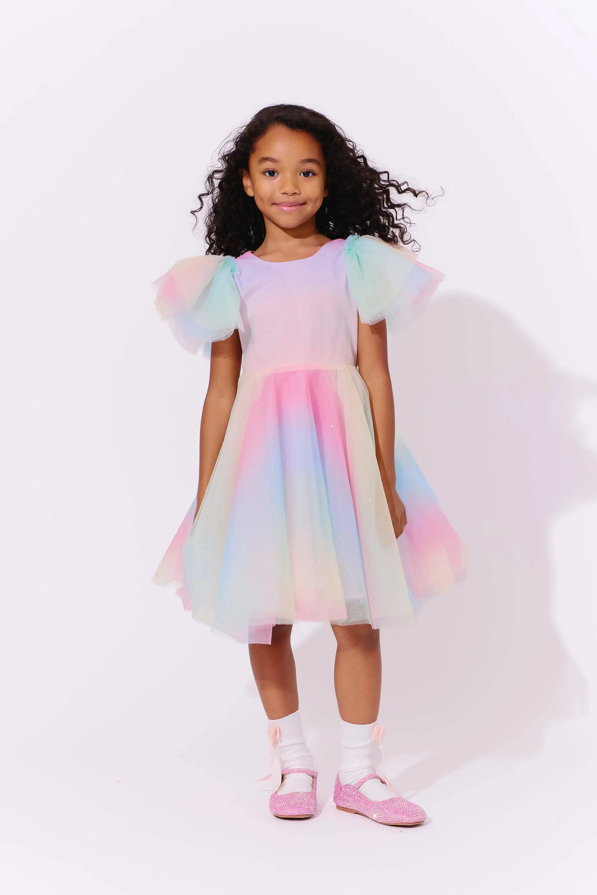 - Dreamy ombre tulle dress in soft pastel shades with delicate sparkle details, perfect for parties and special events.