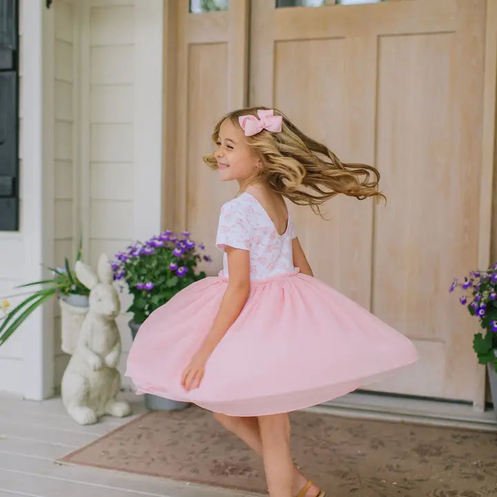 Our Tutu Dress is perfect for little ones who love to twirl and sparkle! Featuring a classic short sleeve printed bodice made from our signature extra soft cotton-spandex blend, this dress is as comfortable as it is magical. The scoop back adds a sweet touch, while the four layers of soft, full tulle create a dreamy, voluminous skirt made for twirling.