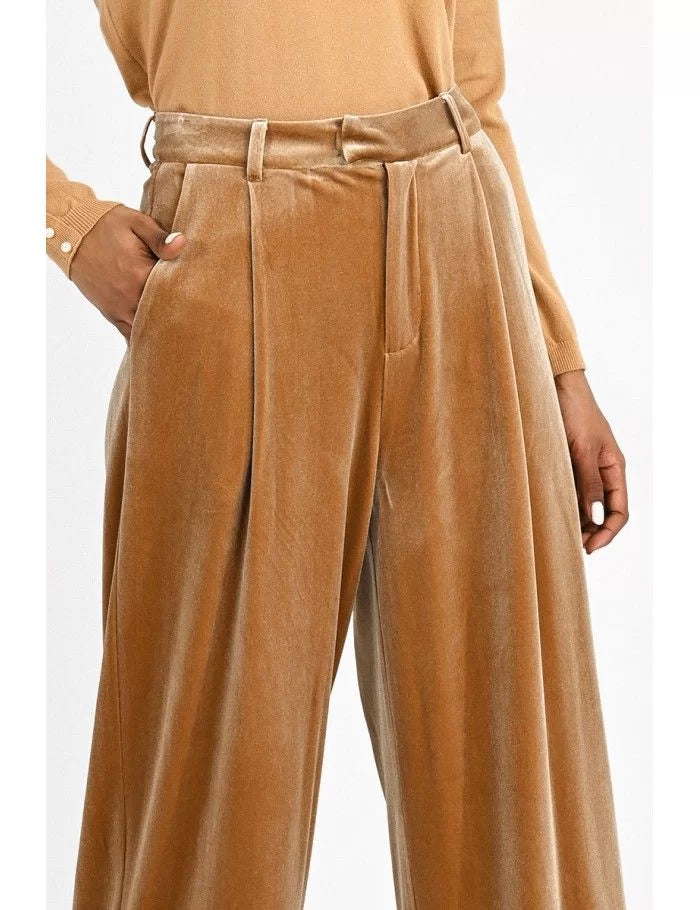 New silhouette for the season. We love these wide and fluid velvet pants. High waist, side pockets.