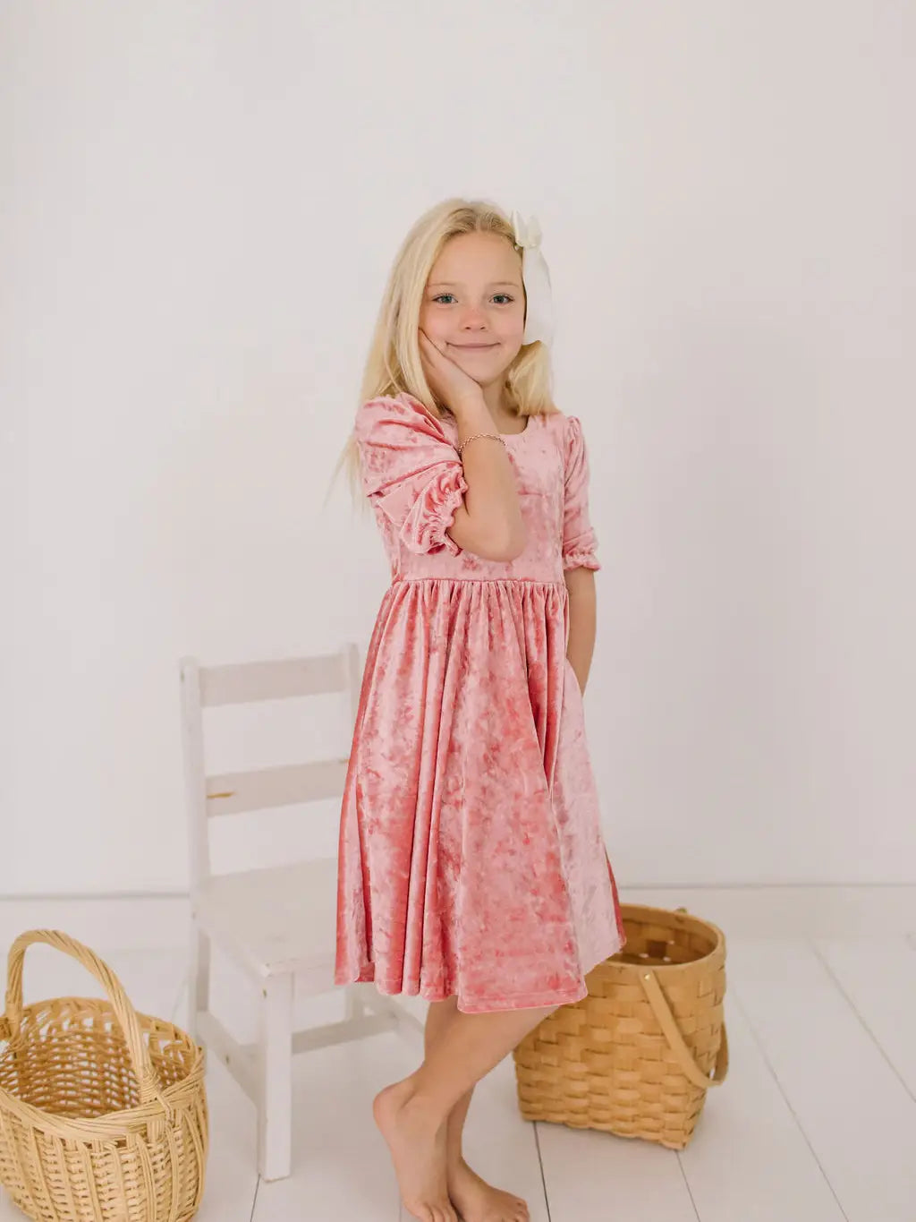 The Pippa Dress combines cozy comfort with charming style. Made from soft velvet fabric, it features 3/4 sleeves with elastic ruffle cuffs, a full circle skirt with handy pockets, and a flattering scoop back—perfect for twirling and everyday wear alike.