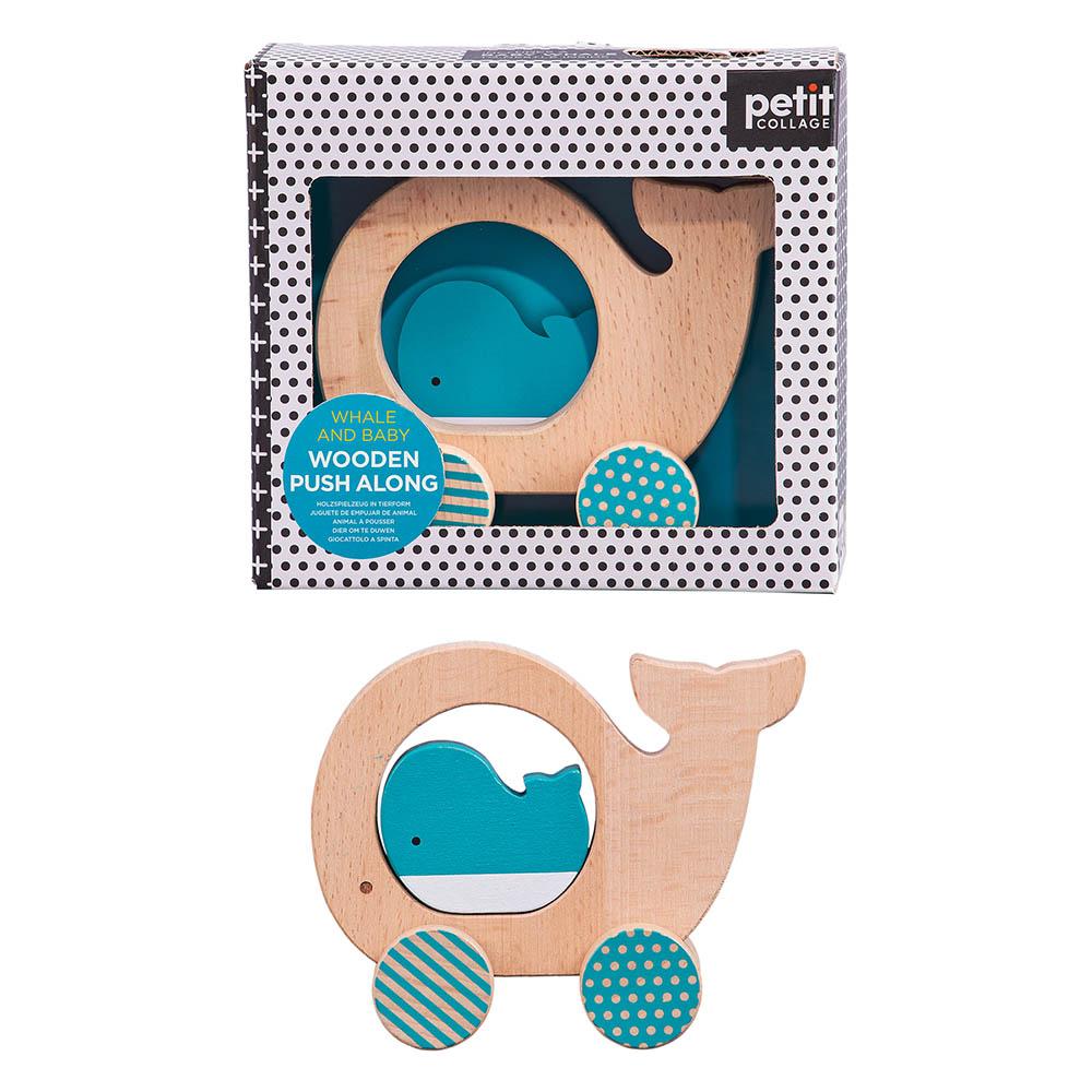 Your little one will love taking this sweet whale toy for a spin! This Whale and Baby Wooden Push Along Toy from Petit Collage has smooth wheels and simple easy to grasp shapes to encourage little ones to push this happy animal along.